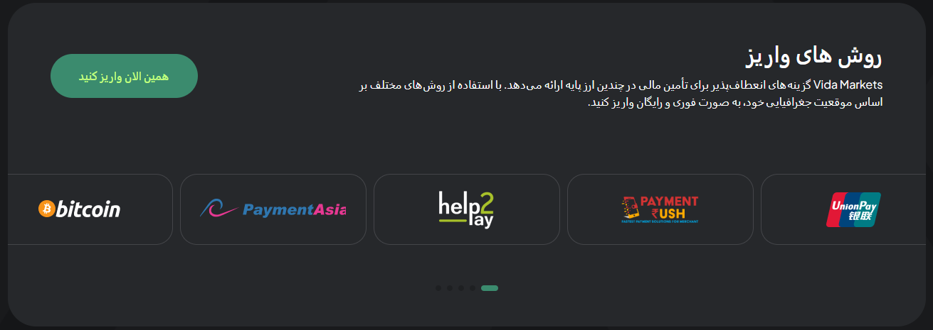 بروکر ویدا مارکتس دارای سایت فارسی است . البته از آنجایی که امکان ارتباط با تیم پشتیبانی بروکر امکان پذیر نبود ، داشتن پشتیبان فارسی زبان هنوز احراز نشده است. احتمالا سایت فارسی بروکر باعث شود که فکر کنید که کاربران ایرانی امکان فعالیت در بروکر را داشته باشند. اما در سایت بروکر به صورت واضح عنوان شده که کشورهایی که در لیست تحریمهای FATF و اتحادیه اروپا/سازمان ملل قرار دارند امکان استفاده از خدمات بروکر را ندارند.