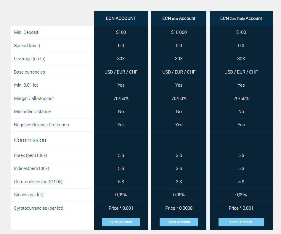 این بروکر 3 نوع حساب معاملاتی با نامهای ECN ،ECN Zulu ،ECN Plus را به معاملگرانش ارائه میدهد. اسپرد در این بروکر متغیر است و به صورت کلی از ۰ پیپ شروع میشود.