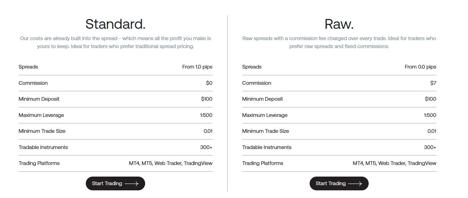 این کارگزاری دو نوع حساب estandard و raw در اختیار معامله گرانش قرار داده است که در تصویر زیر میتوانید جزئیات حساب های را مشاهده کنید.