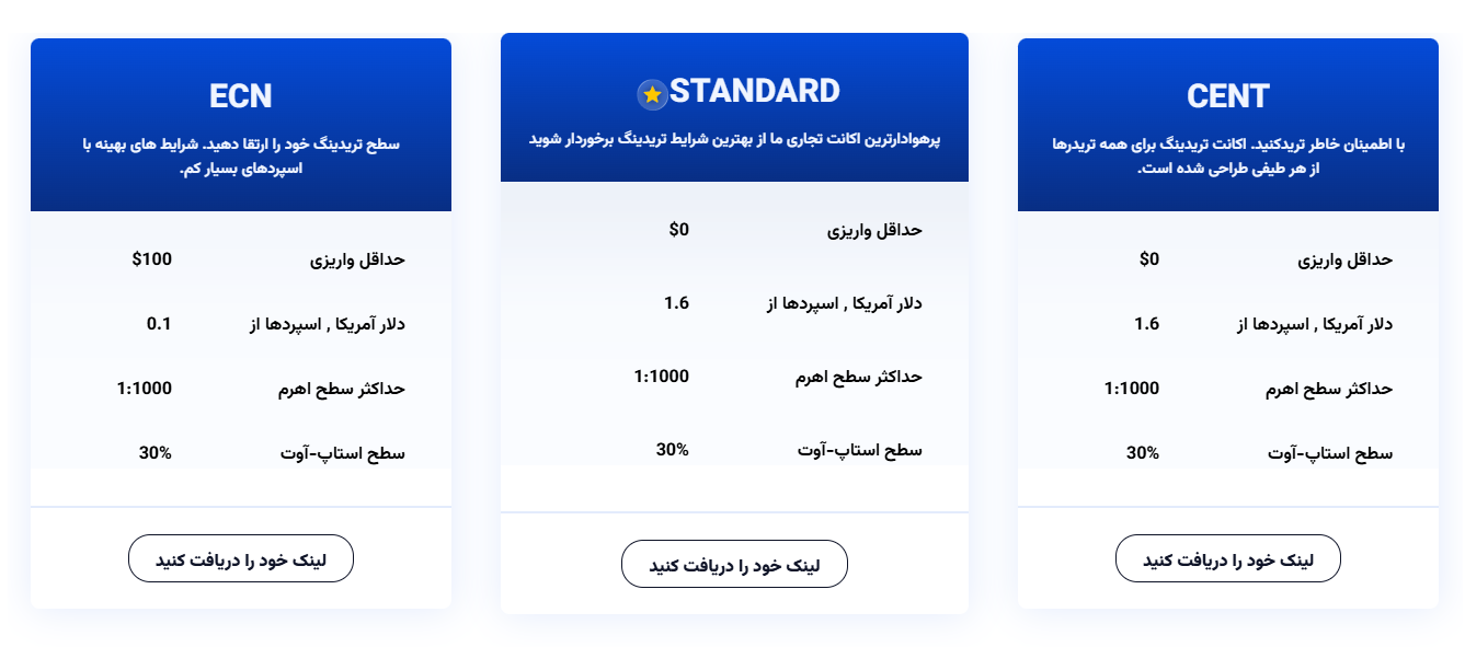 بروکر CG Fintech دارای سه حساب معاملاتی است که شامل سنت، استاندارد و ECN میشود.