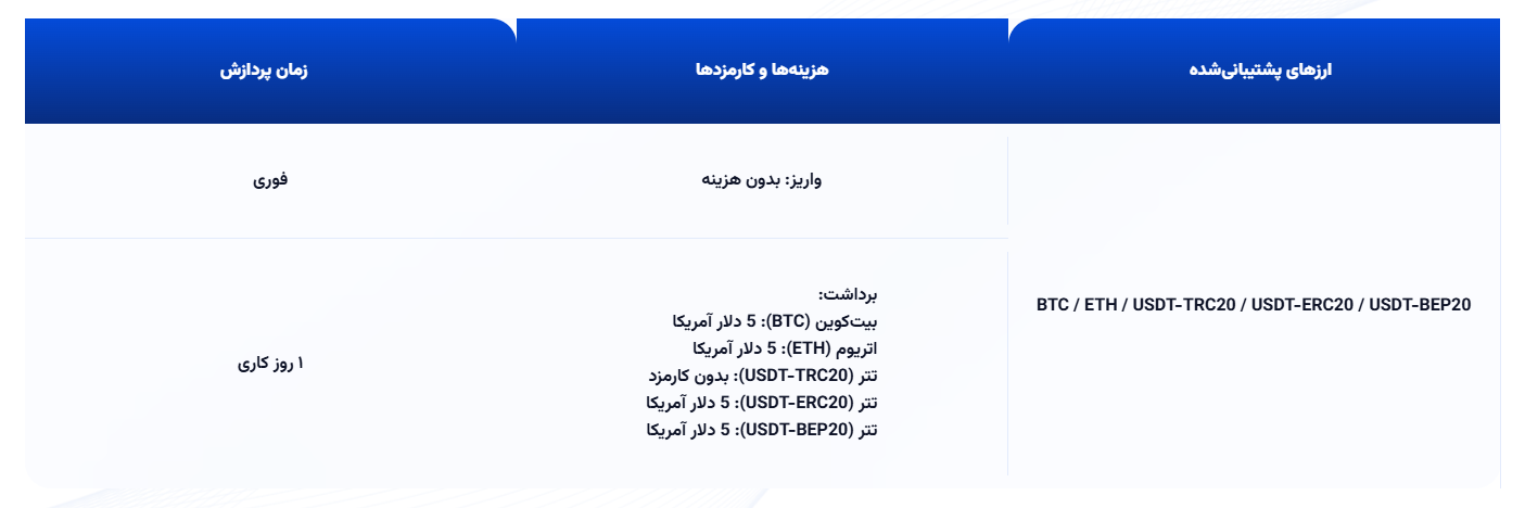CG Fintech برای واریز و برداشت فقط از روش ارزهای دیجیتال پشتیبانی میکند. لازم به ذکر است که بروکر جهت واریز هزینهای جهت کارمزد دریافت نمیکند؛ اما برای برداشت مبالغی از کاربران دریافت میشود. در تصویر زیر مقدار دقیق این مبالغ را مشاهده میکنید.